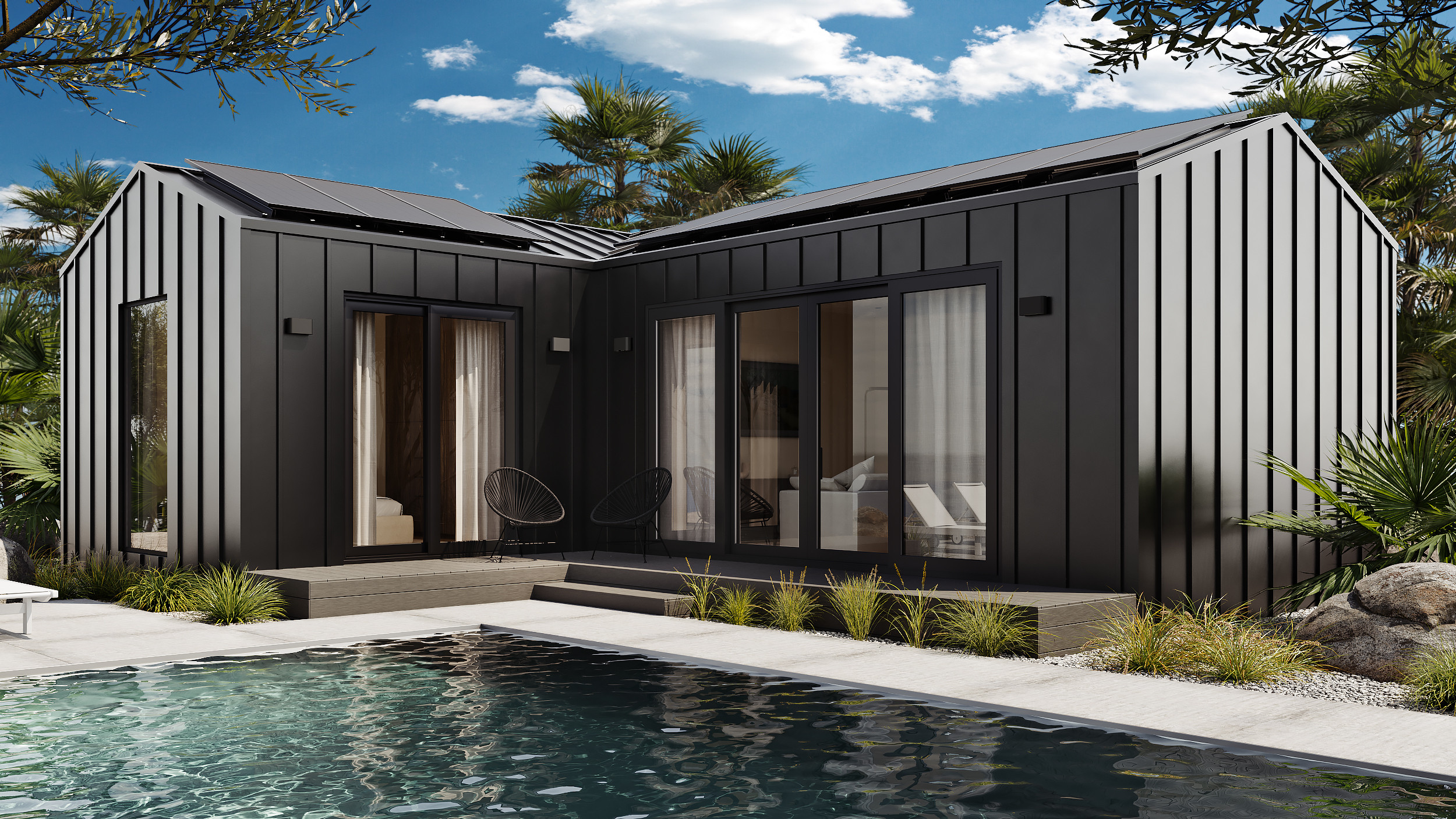 The houses take advantage of flat-pack shipping. Panels, joinery, accessories, fasteners, and the like are fitted securely into shipping containers for easy, efficient distribution.