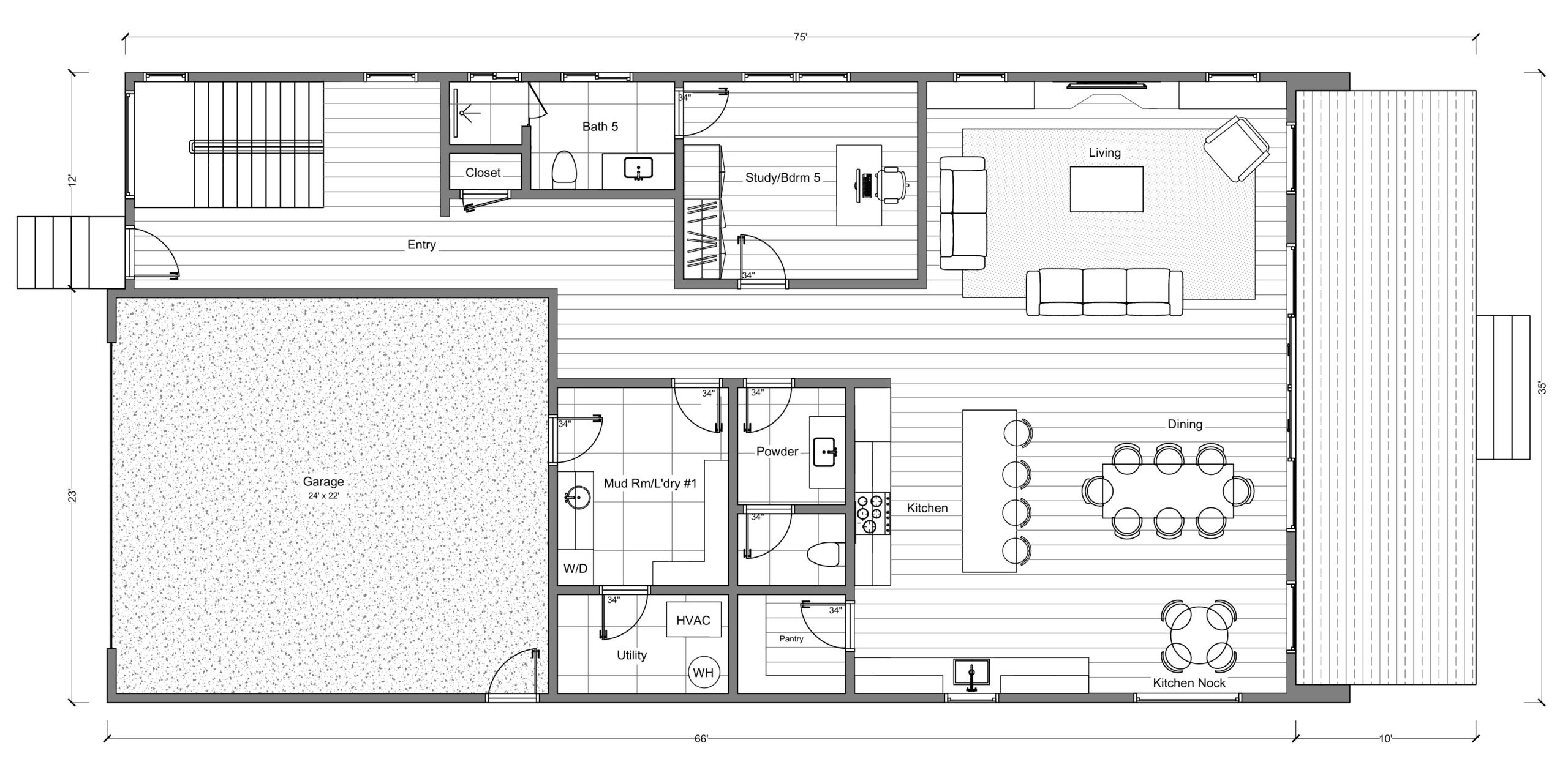 Open-concept kitchen, dining, and living area with an oversized island. Includes a dedicated study and laundry room.