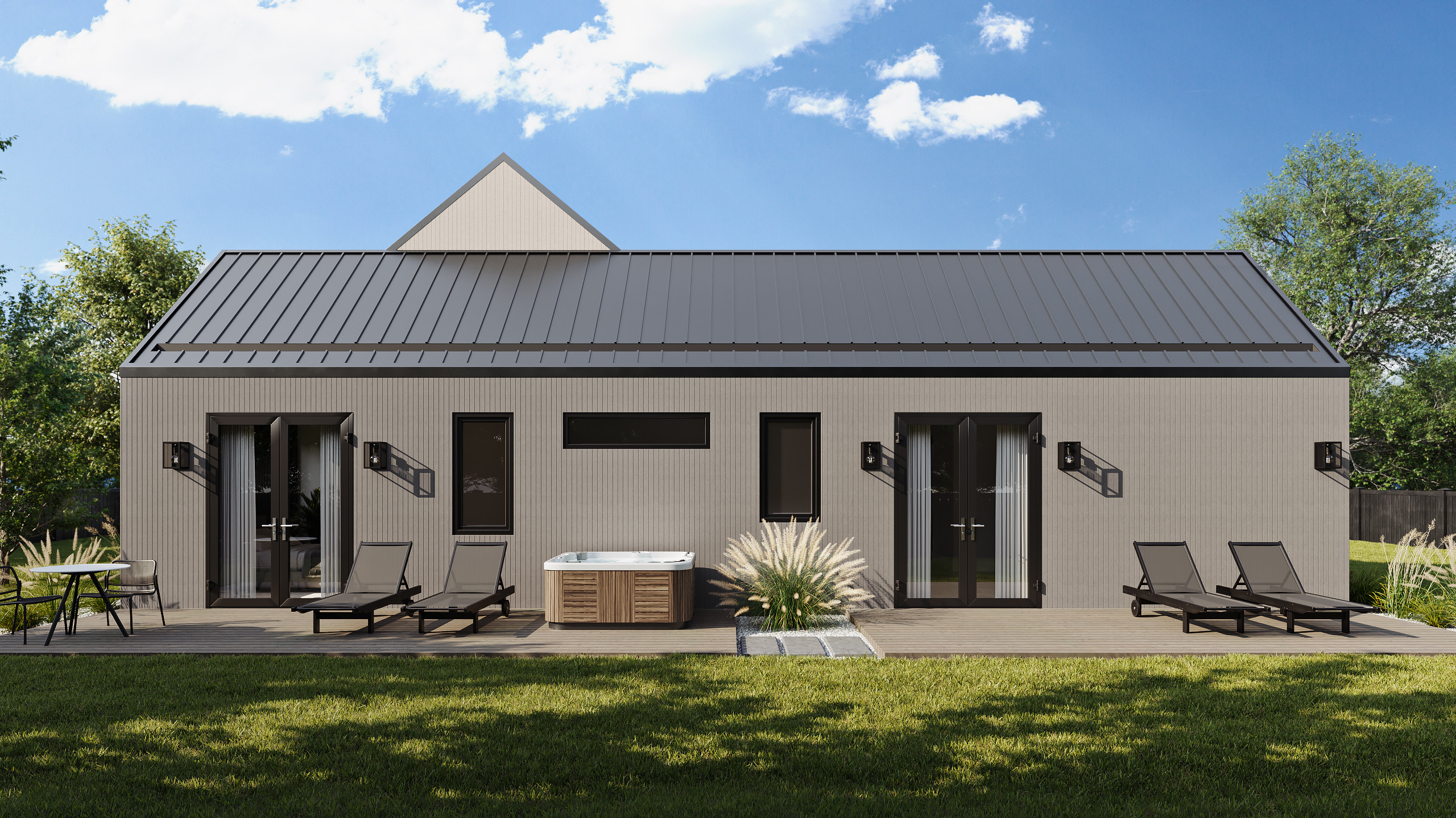 Heavy-gauge aluminum windows offer strength, clean lines, and thermal break efficiency.